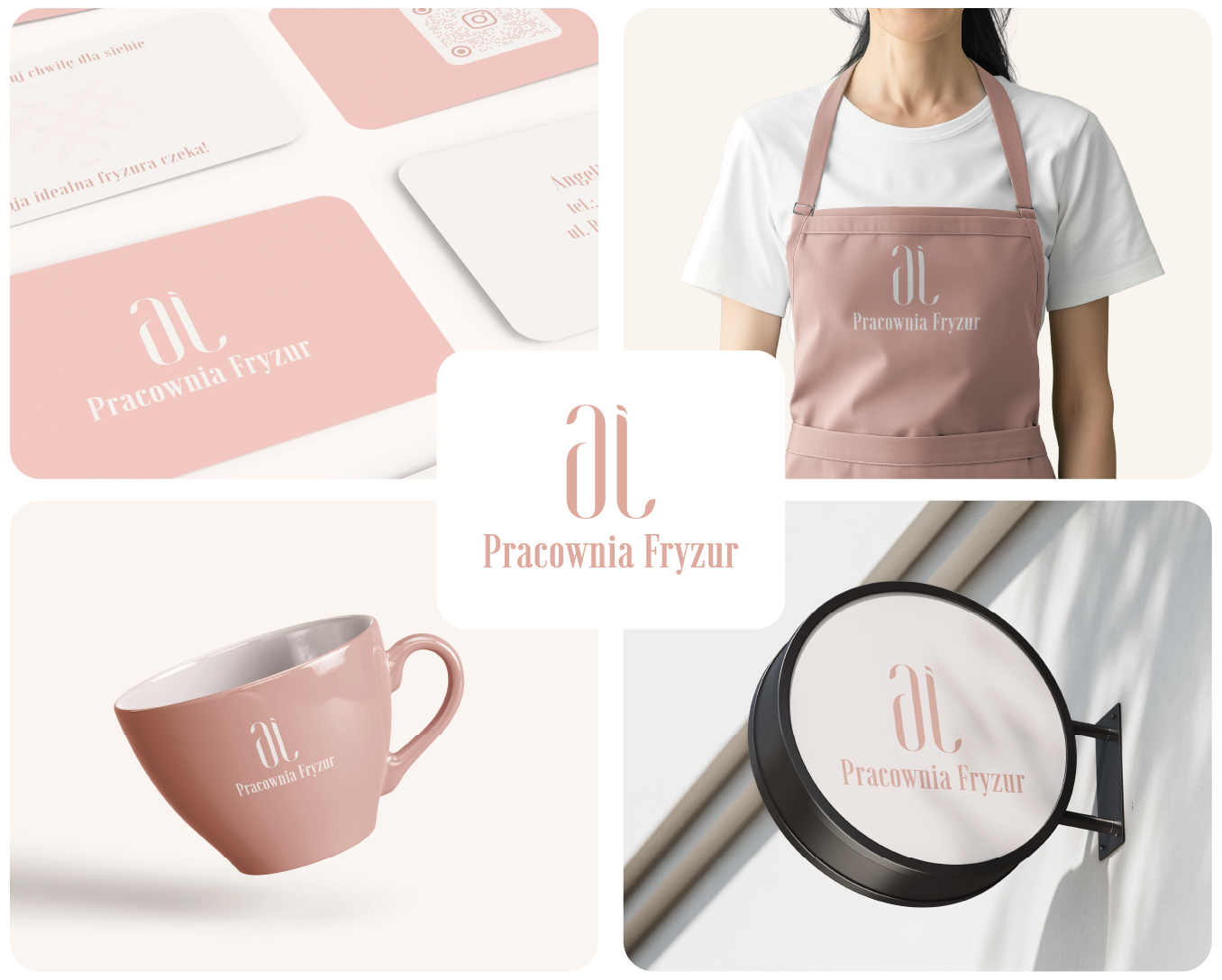Inicjały właścicielki w subtelnej, charakterystycznej formie i kolor dobrany po testach — żaden przypadek. Branding wdrożony kompleksowo: wizytówki, szyldy i detale w salonie. Harmonijna całość, bo w tej branży szczegóły robią różnicę.