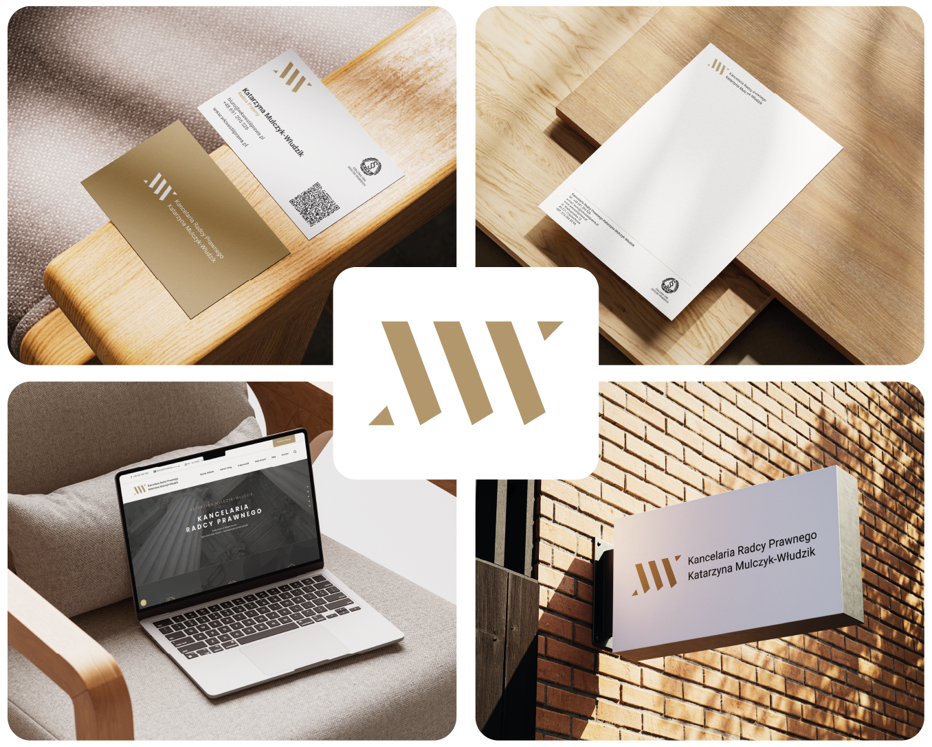 Zwarte litery MW, głęboki brąz, czysta biel i klasyczna czerń. Znak, który komunikuje profesjonalizm i zaufanie — bez zbędnych ozdobników. Identyfikacja obejmuje materiały drukowane, detale biurowe i stronę internetową wkwestiiprawa.pl.