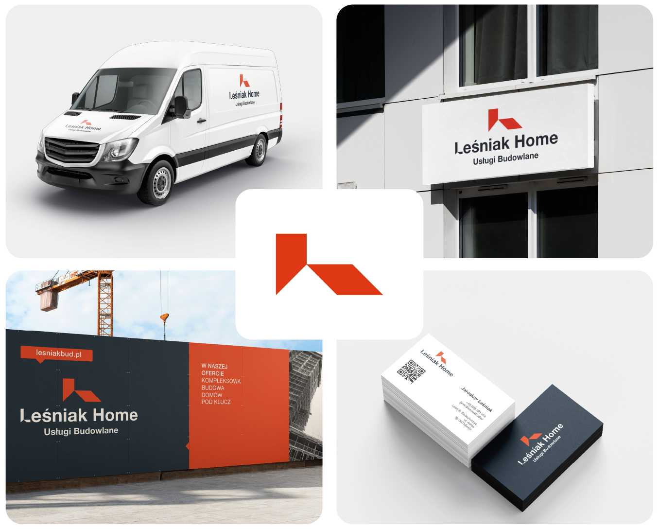 Dach tworzący literę „L” — minimalistyczny znak z charakterem. Ceglany pomarańcz zestawiony z elegancką bielą i głębokim granatem buduje wizerunek firmy, której można zaufać. Identyfikacja wdrożona na każdym nośniku: wizytówki, odzież firmowa i elementy wystroju. Spójnie i bez przypadkowości.